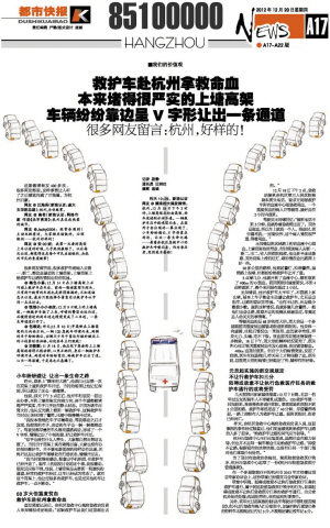 (当年报道:《救护车赴杭州拿救命血 本来堵得很严实的上塘高架 车辆纷纷靠边呈V字形让出一条通道》系列报道 都市快报2012年12月20日-21日)