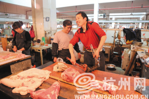 (阿明全名叫俞明,他的肉摊在西门农贸市场2楼2076号,他的手机15968818628,如果附近有单位或个人要买猪肉的,可以跟阿明联系。)