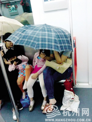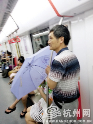 然而昨天,记者在地铁武林广场站上车时,却发现车厢里很有趣的一幕:一位年轻母亲一只手抱着小孩,一只手打着雨伞。