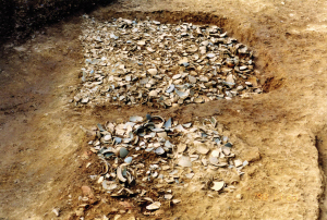 1996年一场暴雨,冲出了满山遍野的碎瓷片,冲出了深锁在凤凰山山坳坳里近千年的秘密——老虎洞窑址,浓缩在泥土层尺寸之间的辉煌眩花了人们的眼睛。老虎洞窑址发掘面积近2200平方米,发现了龙窑、素烧炉、采矿坑、练泥池、釉料缸、辘轳坑、房基等一大批制瓷遗迹。特别是“修内司窑”铭文荡箍的发现,证实老虎洞南宋窑址正是文献记载的南宋修内司官窑。2001年,该窑址入选该年度全国十大考古新发现。