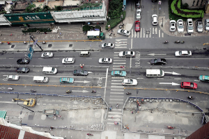 前方的斑马线前,由于没有红绿灯,不听从协管员指挥而横穿马路的情况,也时有发生。这也导致汽车缓慢前行。