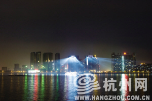 昨晚7点半,大厦楼顶再次射出16束(两幢大厦各8束,景大伯一家前晚被照的8束应该来自西边那幢)巨大而耀眼的光柱,打在钱塘江面,灯火通明。