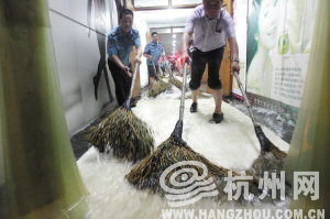 前晚7点50分,钱江市场的保安们在用扫帚奋力排水。 记者 许康平 摄