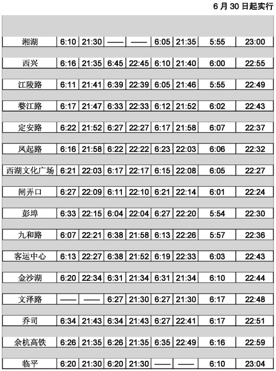 杭州地铁1号线运营时刻表将于6月30日延长全天运营时间至15小时,末班车起点站始发时间延迟至21点30分,以方便广大旅客与市民的夜间出行。