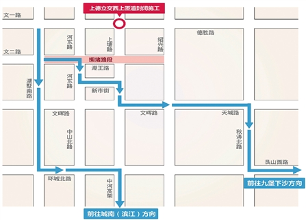 如果是前往城南(滨江)方向的,也建议尽量避开潮王路、上塘路。可以选择走湖墅南路、环城北路从环北立交重新上高架(施工期间,环北立交西向南的原匝道封闭措施是暂停实施的)。