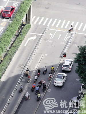 中河北路体育场路口,原本拥挤的非机动车道停止线前,几乎看不见等候红绿灯的电动车、自行车。