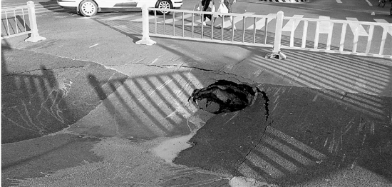 昨天上午,坑洞四周已经用黄色的施工护栏围了起来。记者走近一看,这块地面中间有一个窨井盖,整个地面像漏斗一样往下陷,凹陷一角,还有一个直径大约半米的空洞,从外往里望,里面空空如也,路面很薄、很脆,行人都不敢再靠近,生怕踩上去越塌越大。