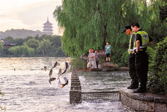 昨天上午,杭州花港观鱼公园门口,鱼儿不断跃出水面,引来市民游客观看。李金德 摄