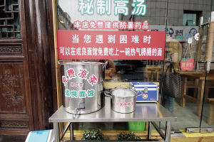 昨天中午,成良面馆门口的凉茶摊上,环卫工人三三两两去接水。凉茶桶边上有一个小药箱,里面放了些防暑药。这两样都是面馆免费提供的。