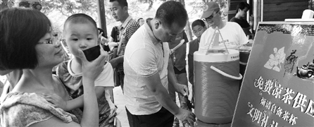 在苏堤春晓志愿服务微笑亭,游客们在免费喝凉茶。 本报记者 吴元峰 李震宇 摄