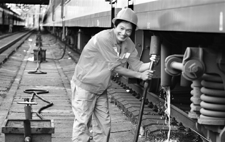 而站台的另一侧,几位身穿黄背心,头戴安全帽的铁路人开始了工作。手拿皮水管,走到列车转向架边的注水口位置,将皮管接上注水口,再打开龙头为列车加水······他们的工作关系到旅客在旅途中的用水状况,却永远行走在车下,烈日下,一列火车18节车厢的上水工作,枯燥得就像是流水线上的机器人。