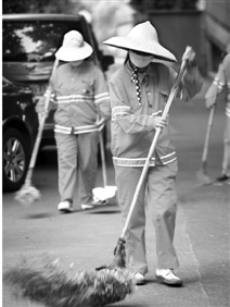 整整一个小时,薛大姐手中的扫把没有停过,扫把扬起的落叶、尘土和热浪糅合在一起,扑向她的脸颊,脸上的汗水止不住地往下淌,她时不时地拿毛巾擦一擦,衣服后背早已“开”出了盐花。