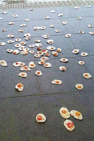 昨天,微博上有张照片被热转,只见地面上“躺着”好多荷包蛋,配的说明是:今天在杭州车站,一个卖蛋的老人家把一篮子鸡蛋打翻了,然后,这是5分钟后的照片……杭州的温度你们感受下吧。