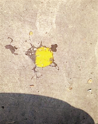 结果,3分钟过去了,5分钟过去了,鸡蛋在地面上流得一塌糊涂,蛋清还是那个蛋清,没有变成蛋白的迹象;蛋黄也还是那个流质的蛋黄,并没有凝固起来。实验宣告失败。(图片为鸡蛋打碎在路面上5分钟后的效果)