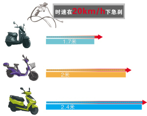 第一组实验分别在三类车中挑选一辆,按照国家规定的20km/h的车速行驶,到指定位置刹车,三辆车都能马上停下,轻便型电动车刹车距离为2米,中型和重型分别是2.4米和1.7米。可以看到三辆车的刹车距离离国家规定的4米还有不少余地。