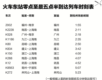 从凌晨零点至第二天清晨五点半的这五个半小时内,有11趟列车会停靠杭州东站。