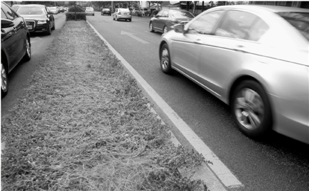 道路灌木零星枯死,新栽乔木苦苦支撑