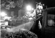 为保住杭城的绿色,绿化工人们每天都要浇一个通宵的水。 蒋慎敏 摄