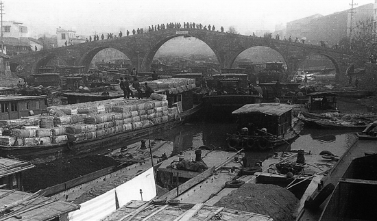 下船靠岸的第一站,广济桥,这座500多岁的七孔石拱桥,一直是杭州运河段的一个标志。
