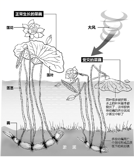 “现在,晚熟藕只长出两节,还要1个月的时间才能长全到五六节。大风刮过,泥土松动,浮在水面上的荷叶纷纷倒伏,而荷叶本来是负责给幼藕提供养分和阳光雨露的,这样一来,幼藕的营养通道就断了,很容易死掉。如果不及时抢救,对于藕田来说,就是灾难性的。”