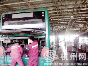 下午3点左右,记者来到杭州公交石桥修理分公司的修理厂,维修厂二级维修组的组长郑裕富师傅迎了出来,满头大汗,脸上、手上、工作服上都沾满了一层黑黑的机油。