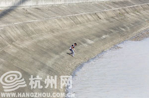 下午2点30分,一名20岁的年轻人突然跳下江堤,手持网兜,一路向下滑到江边。