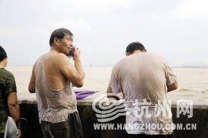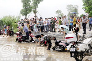 江堤上的电动车倒了一片,不知道是被潮水击倒,还是被四下逃窜的人群给碰到的。
