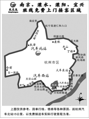 杭州到南京、溧水、溧阳、宜兴班车的免费接送,是在汽车北站周边15公里范围,大致在南庄兜-杭宁高速仁和入口-东西大道-文一西路-高教路-天目山路-西溪路-灵溪隧道-梅灵北路-三台山路-南山路-万松岭隧道-中河南路-望江路-秋涛路-庆春东路-新塘路-新风路-机场路-同协路-石大路-绕城公路-南庄兜围合区域内。