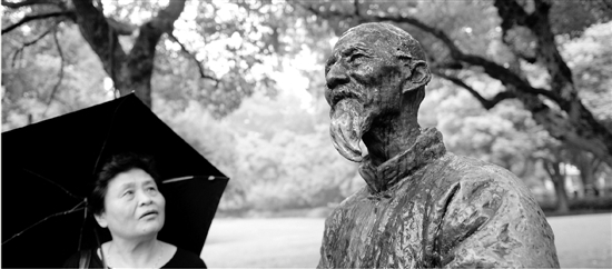 据了解,黄宾虹铜像是由中国美院青年雕塑家刘杰勇2008年创作而成,参照画家洪世清当年为黄宾虹拍摄的写生照片,乍一看,仿佛是黄宾虹先生站在西泠桥边写生。“黄宾虹先生是我国近代杰出的国画大师,晚年长住栖霞岭,与西湖为伴,直至逝世。在晚年高龄时经常入山傍湖坚持写生,他的许多重要作品是在西子湖畔完成的。所以在景区立了大师的雕像。”