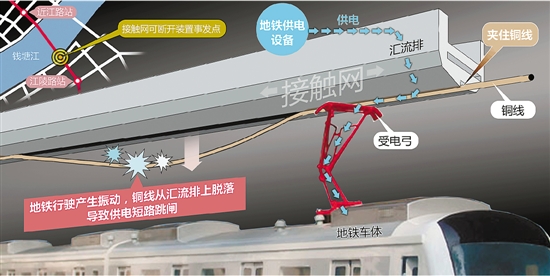 要想让地铁跑得顺畅,这一系列亲密的“小接触”缺一不可。而前天晚上恰恰就是铜线和汇流排之间出了乱子:汇流排和铜线结合处松动,当列车受电弓行驶至此,铜线脱落,引起了供电短路,继而跳闸,没了动力的地铁列车就此趴窝。
