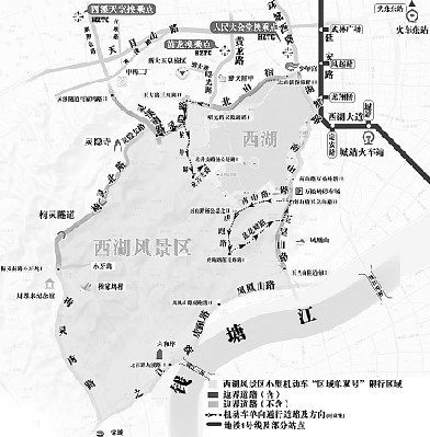 曙光路(浙大路口至灵隐路口段)借道供由北向南通行,杨公堤(花圃门口至灵隐路口段)借道由南向北通行,南山路(万松岭路至玉皇山路口段)借道供由北向南通行。