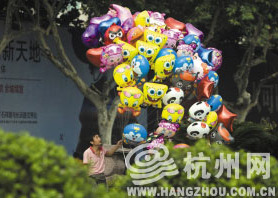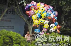 昨天下午,西湖边,一位摊贩在兜售气球。 记者 胡聪 摄
