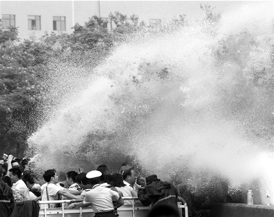 不少观潮者被来势汹汹的潮水淋得全身湿透,十分狼狈。记者 吴煌 摄