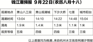在这个观潮的正日子里,钱塘江潮将上演年度最疯狂的一幕:根据杭州水文信息网的实时预测——杭州境内的萧山八工段、萧山观潮城、下沙大桥将分别在下午13点04分、14点10分、14点22分出现1.9米、1.4米、1.3米的巨浪,是观潮爱好者不容错过的最佳观赏时间。