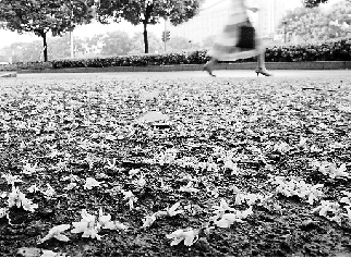 昨日阵雨过后,杭城一条马路上落满金色的小花。记者 杨晓轩 摄