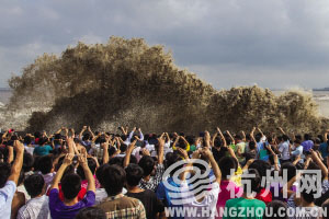 昨天,钱江潮在下沙七格段掀起巨浪,观潮者纷纷举起手机和相机。 记者 陈中秋 摄