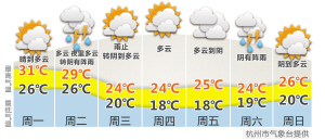 按照气象上的标准,连续五天日平均气温在22℃以下,就算“入秋”。看看一周天气预报图,从本周三开始,杭州已经离这个标准非常接近。2013年的秋天已经触手可及,说不定,本周就会启幕。
