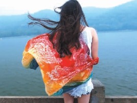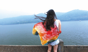 锦带桥,一位游客的披肩随风飘起。记者 陈荣辉 摄