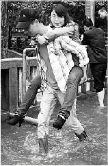 昨天,北山路与环城西路路口严重积水,许多杭州市民互助过“河”。 记者 吴煌 摄