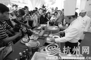 红烧肉500克、栗子250克,辅以各式作料,再盛进一个12英寸的韩式餐盘里,一份香气袭人的栗子烧肉就从厨师手中新鲜出炉了。昨天下午,钱江新城市民中心南广场的一个展位被围得水泄不通,美食爱好者们拿着相机,争相拍下大厨胡忠英的做菜过程。