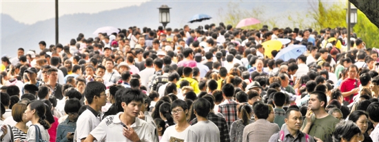 10月3日中午时分,断桥被挤得水泄不通,当日西湖景区的游客突破100万。