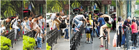 10月2日,岳王庙前的隔离栏,成了众多游客练习跨栏之地,既不文明又很危险。