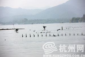 两只鸬鹚站在柳浪喷泉架上 西湖水域管理处副中队长 朱碧颖 摄