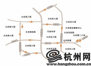 2.东片:盛苑路东向西单行,塘苑路西向东单行,苑东路南向北单行,大关公园北路西向东单行,晓苑路保持双向通行。