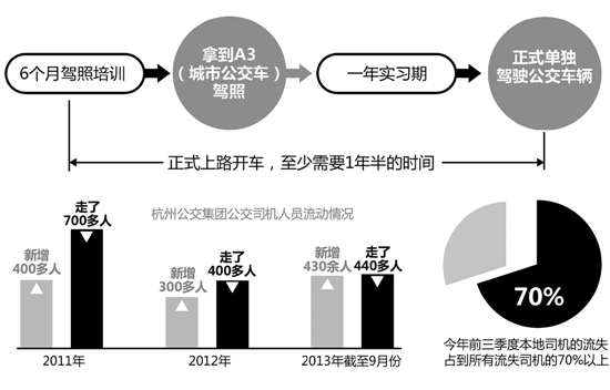 刘师傅说,许多和他一起跳槽的公交司机其实想法都很相似:这一行太辛苦,睡得少,工作时间长。“有A1、A2驾照的人本来就少,他们可以选择开快客大巴。而要开公交车还得培训一年半到两年时间,才能拿A3驾照,这两年时间只能拿基本工资,很多人觉得不划算。”