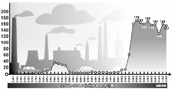 根据杭州国家基准气候站42年(1971-2012年)的观测数据来看,2003年开始,杭州霾日出现跳跃式增长,此后近十年(2003-2012年)年平均达159天,最多则是2004年的176天。