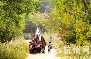 江洋畈公园,树叶变黄,正是学生秋游的好季节。