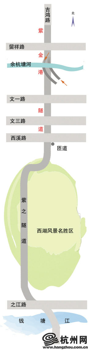 紫之隧道工程南起之浦路、之江路,北至紫金港路、西溪路,线路全长约14.2公里,其中隧道长13.9公里,将是全国最长的城市隧道群。隧道为双向6车道,设计时速为60公里,没有红绿灯,全线只要约15分钟车程。紫之隧道的北面出入口,在文三路紫金港路交叉口以南400米左右,已经在开挖之中。目前,工程占据了紫金港路中间的车道施工,机动车从两边走,双向四车道通行。