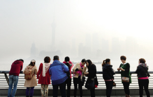 上海,游客在雾霾笼罩下的外滩观光平台。