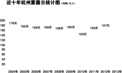 据杭州国家基准气候站统计数据显示,截至11月5日,杭州2013年已有209个雾霾天了,其中仅10月份就多达26天。这意味着,今年以来,杭州主城区三分之二的时间都处在雾霾之中。